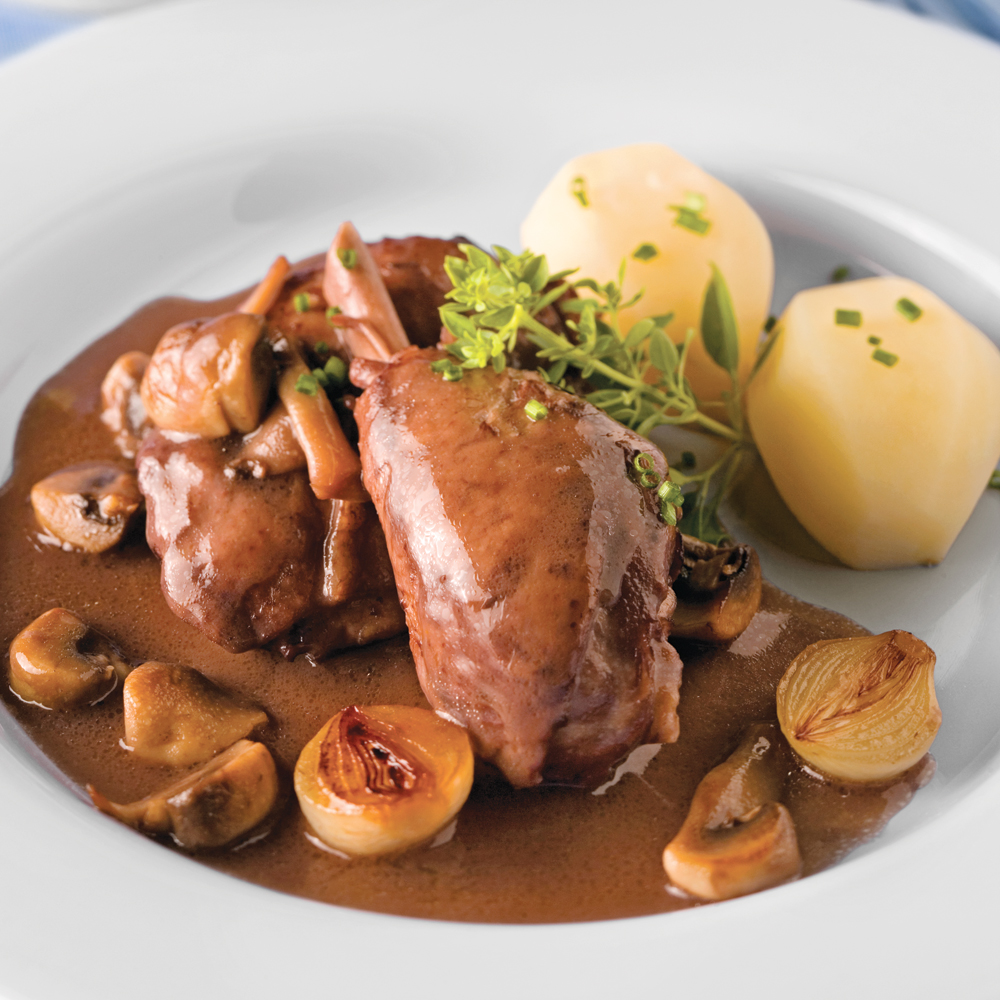 El Coq au vin (gallo al vino) es un estofado francés de legendario origen, se dice que de las épocas de la invasión romana, y destaca por su sabor y textura. No me lo pierdo cuando lo veo en alguna carta, lo procuro sin duda. La cocción lenta en vino tinto de este recio animal, dándole dos o tres litros de “un bon vin rouge” hasta que afloje, deja su carne muy suave al paladar, mientras el vino restante se aprovecha para formar una salsa gruesa y deliciosa elaborada con tocino, mantequilla y cognac, a la que se agregan unos champiñones, zanahoria y cebollitas. Todo esto lo hace un platillo digno de los mejores momentos. Así lo he pensado desde que lo probé por primera vez en circunstancias por demás afortunadas, allá por los años noventas.